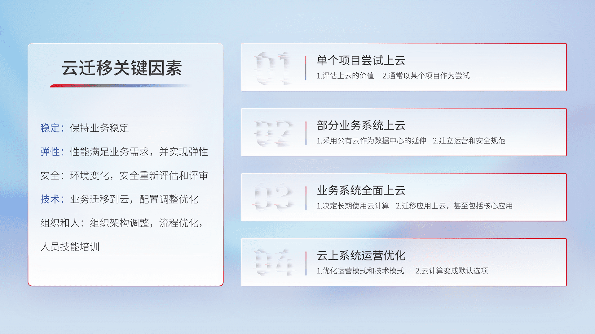结合实际业务,,,,从规划设计、、、、云平台选型、、、云原生改造、、、数据迁移、、、集成交付,,迁移全过程为客户识别最佳上云路径,,,做好风险识别管理,,,,设计网络架构、、身份权限、、、安全审计合规、、操作审计、、日志审计、、、监控告警策略、、、、多站点容灾设计等,,,对云上基础设施进行整体规划,,,提升IT治理水平,,,,以满足弹性、、、高可用、、、高性能的需求。。