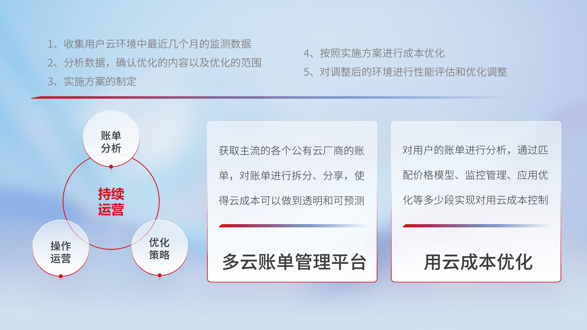 通过多云纳管,,,,以统一的资源数据模型把客户的云资源进行抽象和封装,,,进而实现对多云资源的统一操作,,,保障云资源管理的可靠性、、稳定性与可用性。。量身定制化运维内容,,,,配置、、开发运维、、、、补丁管理、、备份、、监控、、认证和访问管理、、、、审计和日常巡检等,,,保障在用云过程中的可靠度,,,稳定度以及高可用率。。。